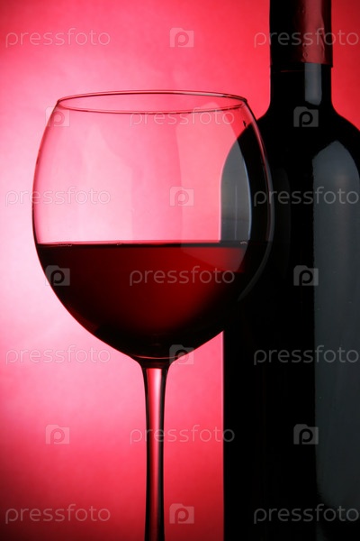 Бокал и бутылка красного вина крупным планом на красном фоне