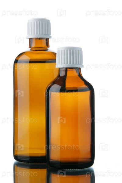 Бутыльки с лекарством на белом фоне