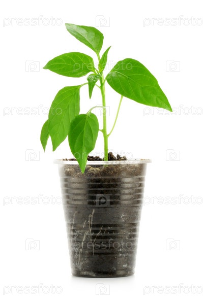 Зеленый проросток в пластиковом стакане с землей на белом фоне