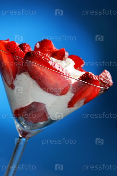 Клубника со взбитыми сливками в креманке на синем фоне