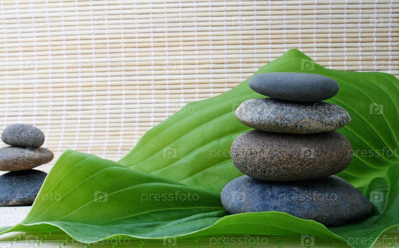 Камни для спа-процедур на зеленом листе на фоне циновки