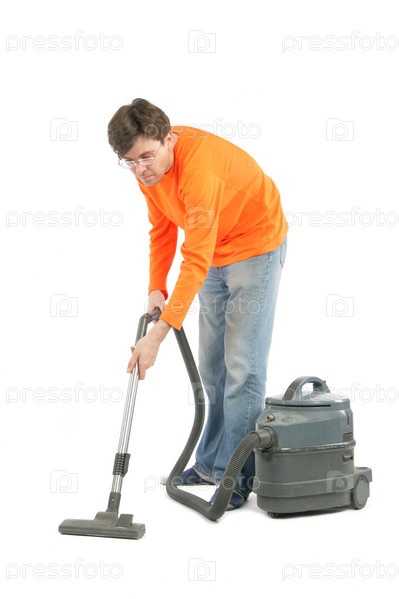 Мужчина с пылесосом на белом фоне