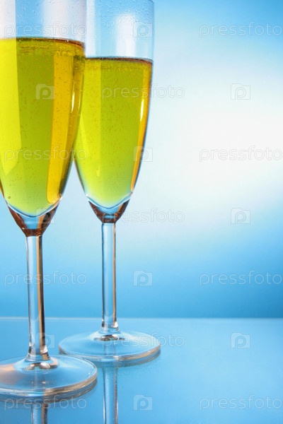 Два бокала шампанского на голубом фоне