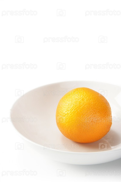 Апельсин на тарелке на белом фоне