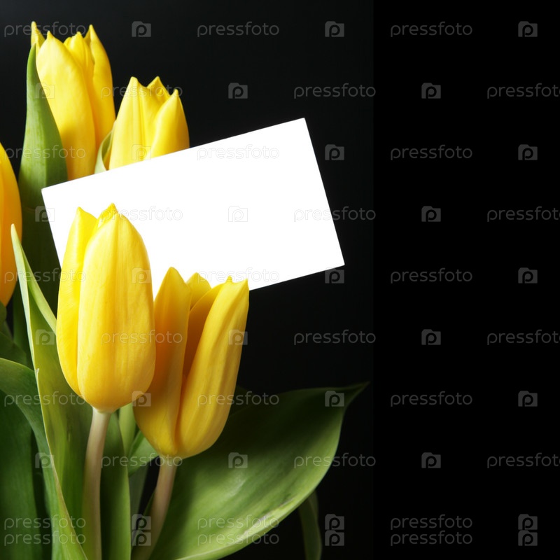 Букет желтых тюльпанов и пустая карточка на черном фоне