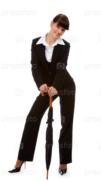 Портрет улыбающейся девушки в черном костюме с зонтом-тростью