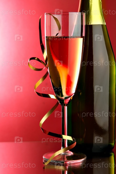 Бокал и бутылка шампанского на розовом фоне