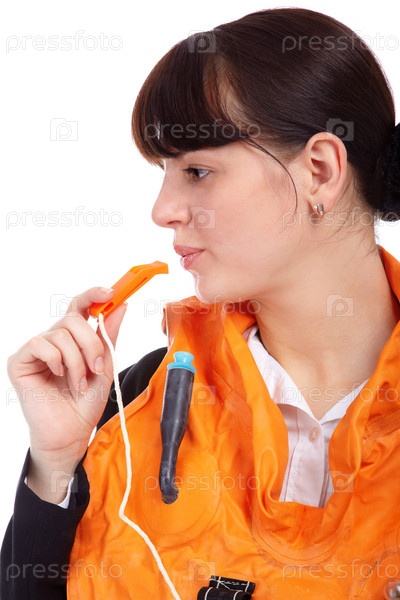 Портрет девушки-стюардессы, показывающей инструкции по технике безопасности в спасательном жилете