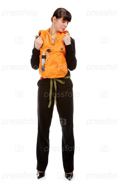 Портрет девушки-стюардессы, показывающей инструкции по технике безопасности в спасательном жилете