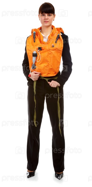 Портрет девушки-стюардессы, показывающей инструкции по технике безопасности в спасательном жилете