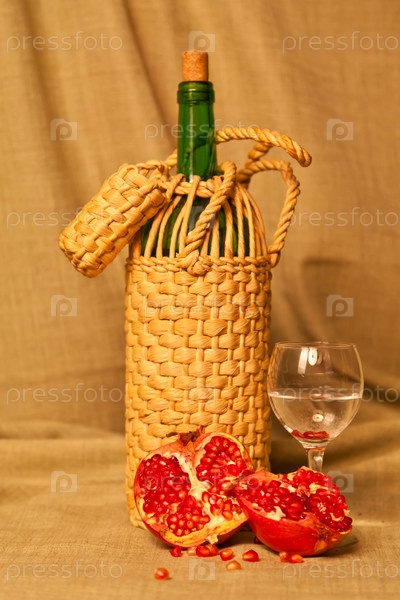 Бутылка вина и гранат на коричневом фоне