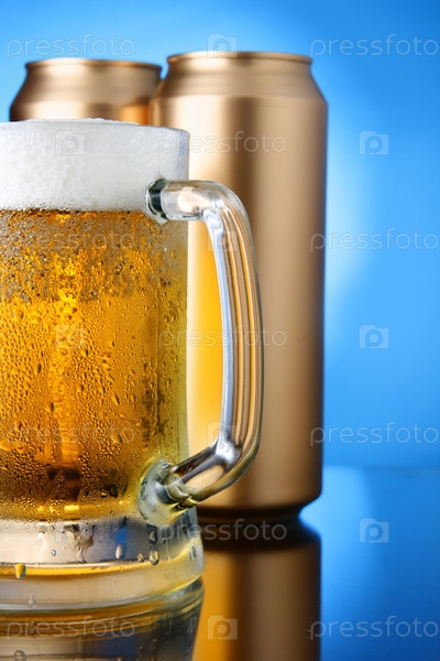 Кружка пива и две банки на голубом фоне