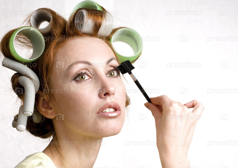 Женщина в бигудях красит ресницы