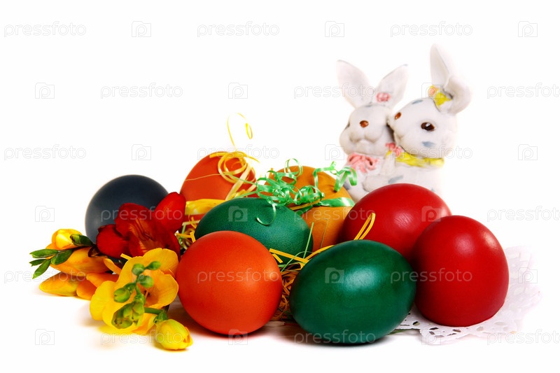 Разноцветные яйца и пасхальные кролики на белом фоне