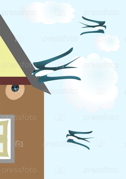 Нарисованные ласточки у крыши дома
