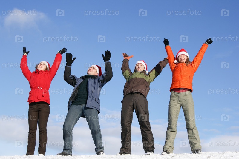 Четверо друзей в шапках Деда Мороза стоят с поднятыми руками