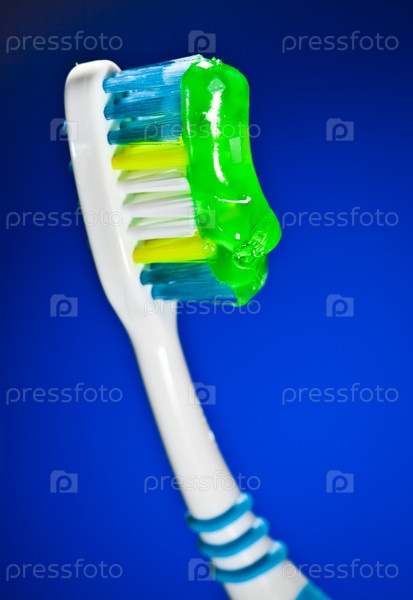 Зубная щетка с пастой на синем фоне