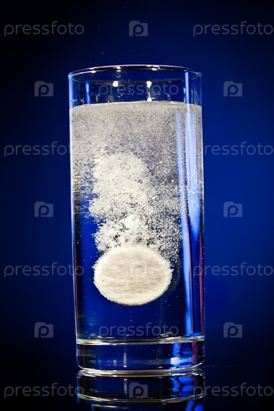 Шипучиая таблетка в стакане с водой на темно-синем фоне