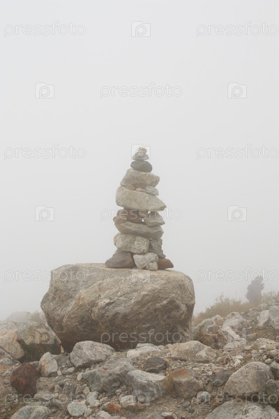 Индекс следит в тумане.На заднем плане одинокий альпинист
