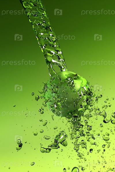 Яблоко и брызги сока на зеленом фоне