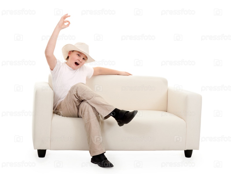 Мальчик-подросток сидит на диване в ковбойской шляпе