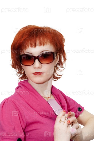 Девушка в очках и с мобильным телефоном на белом фоне