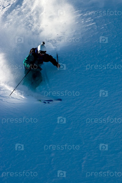 Горнолыжник в снежной пыли