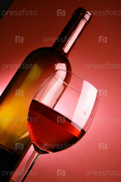 Бокал вина и бутылка на розовом фоне