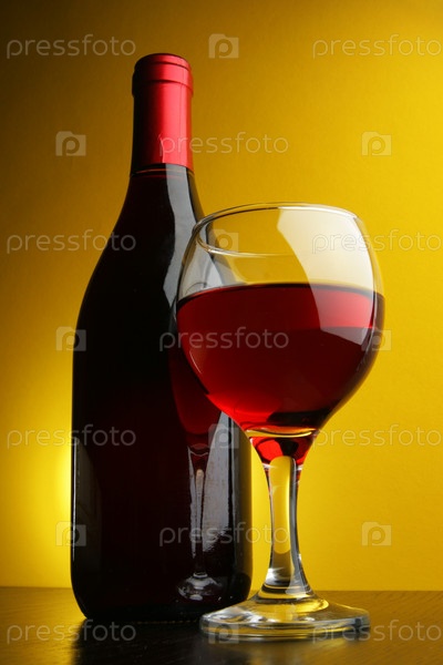 Бокал вина и бутылка на желтом фоне