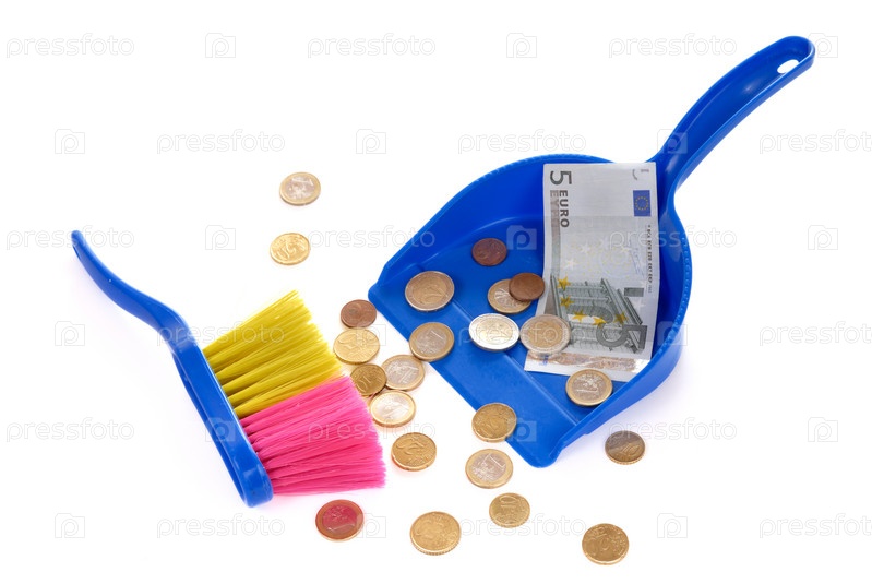 Щетка и совок с деньгами на белом фоне