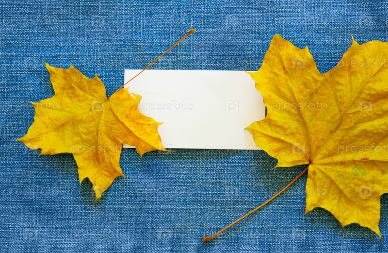 Бланк визитной карточки и кленовые листья на синем фоне