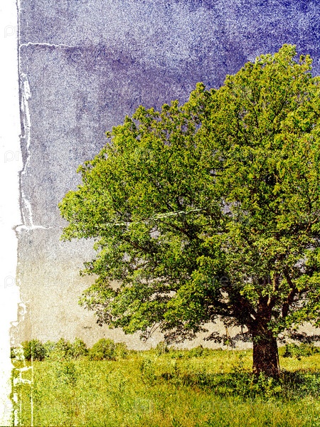 Дерево в поле, цветное изображение на мятой бумаге
