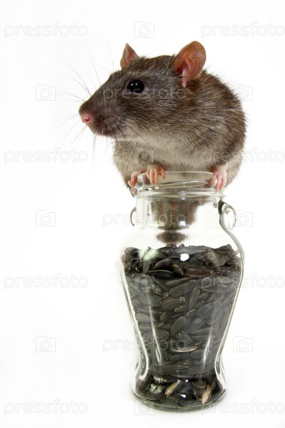 Большая серая крыса на белом фоне с семечками подсолнечника