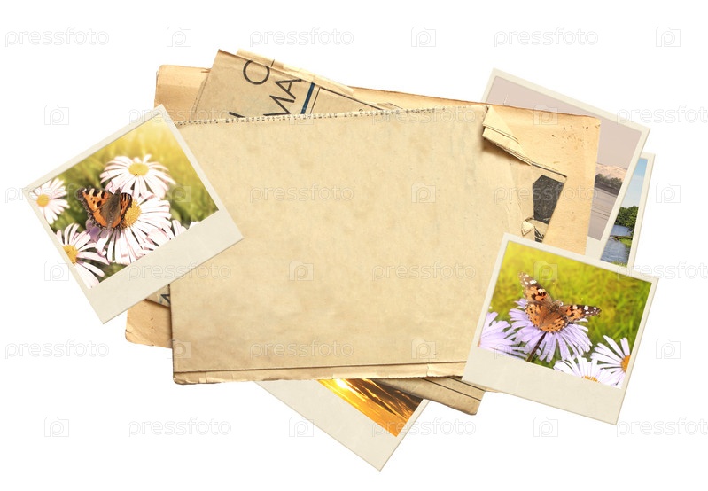 Старые фотографии и пожелтевшая газета, изолированные на белом фоне