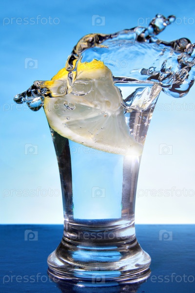 Долька лимона падает в рюмку с водкой