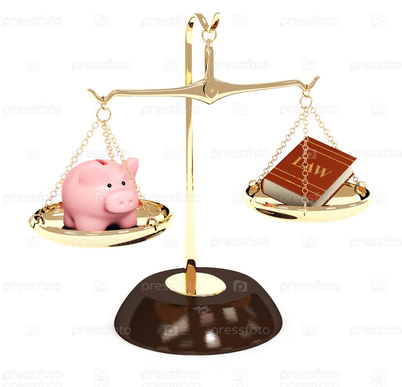 Копилка и свод законов на чашах весов, иллюстрация на белом фоне