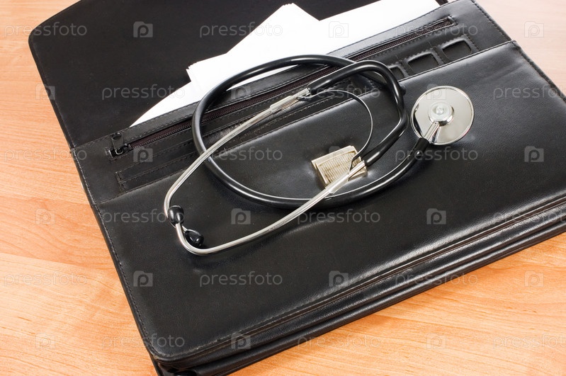 Черный портфель и стетоскоп на столе