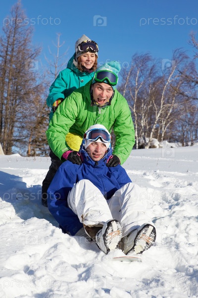 Группа молодых сноубордистов на природе