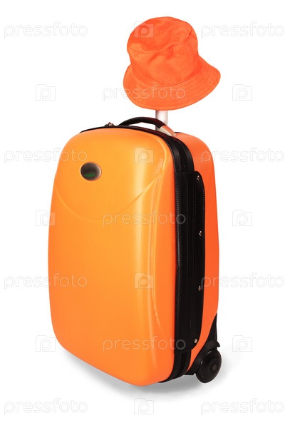 Оранжевый чемодан и панамка на белом фоне
