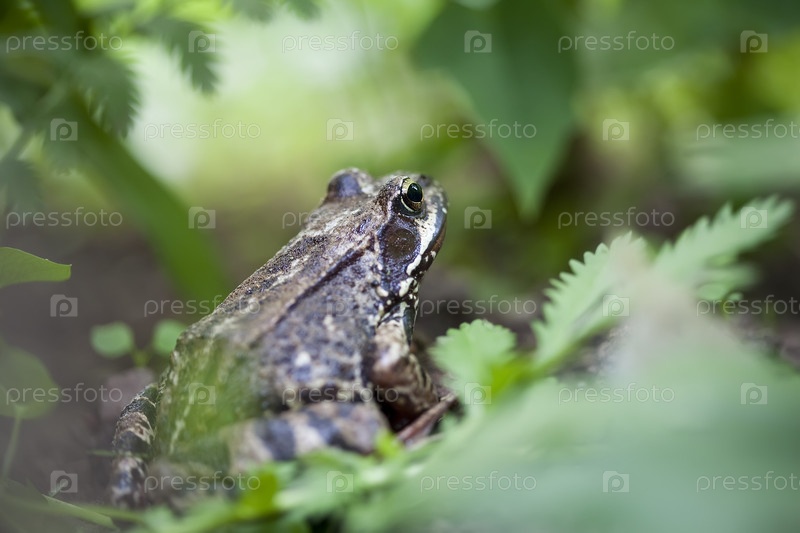 Лягушка на фоне зеленых листьев