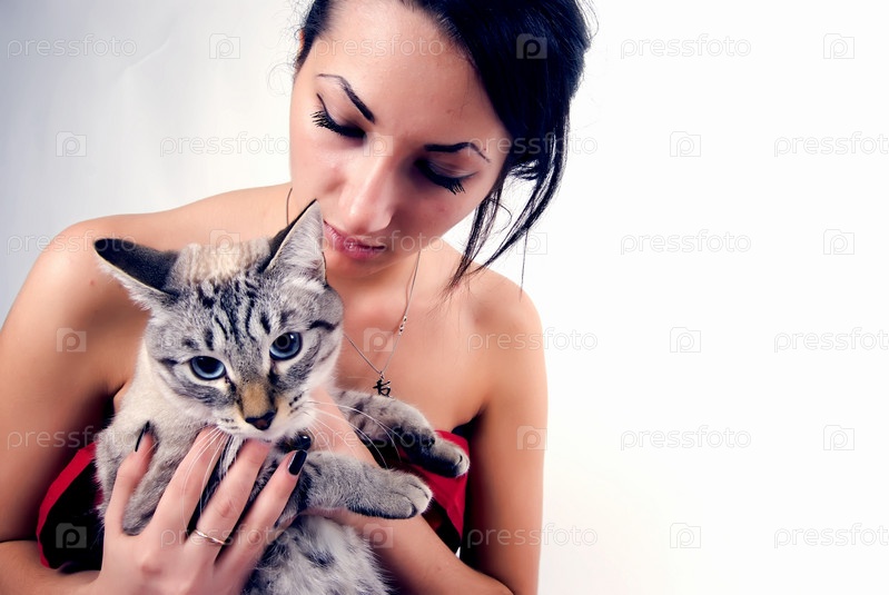 Красивая брюнетка в красном платье держит голубоглазую кошку, на светлом фоне