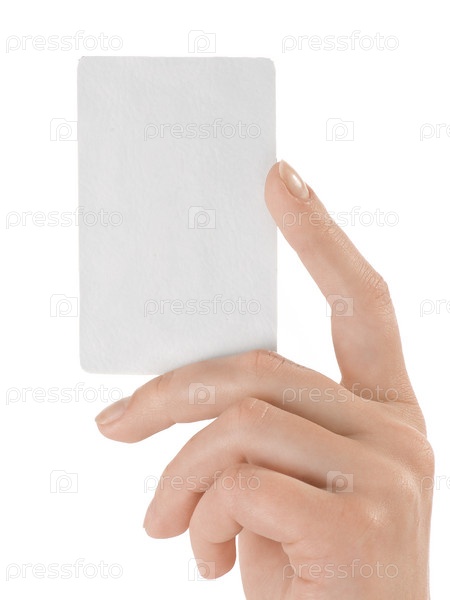 Чистая белая визитка в женской руке на белом фоне