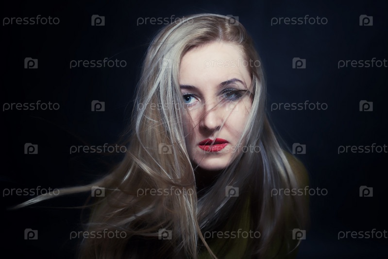 Голубоглазая женщина с развевающимися волосами на черном фоне