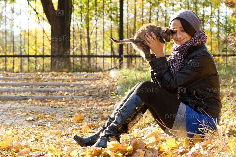 Брюнетка с котенком в парке в теплый осенний день