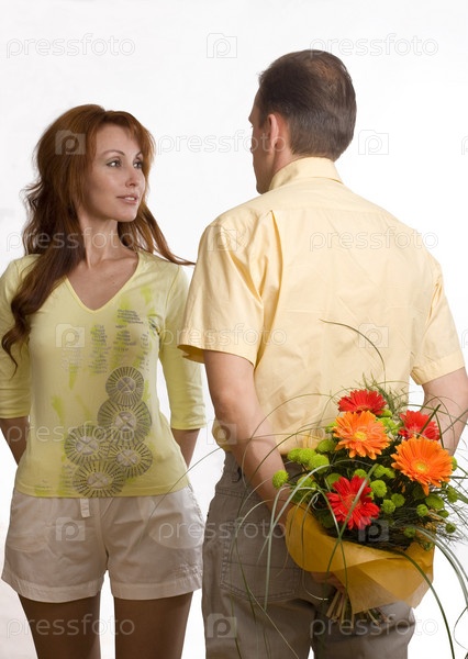 Мужчина прячет за спиной букет