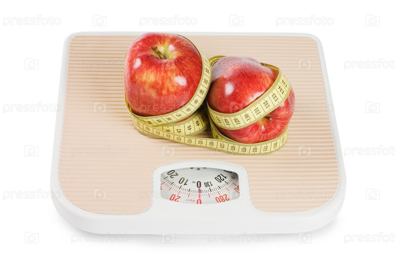 Сантиметровая лента с яблоками на весах на белом фоне