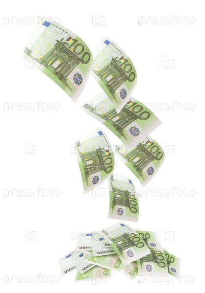 Купюры евро падают, изолированные на белом фоне