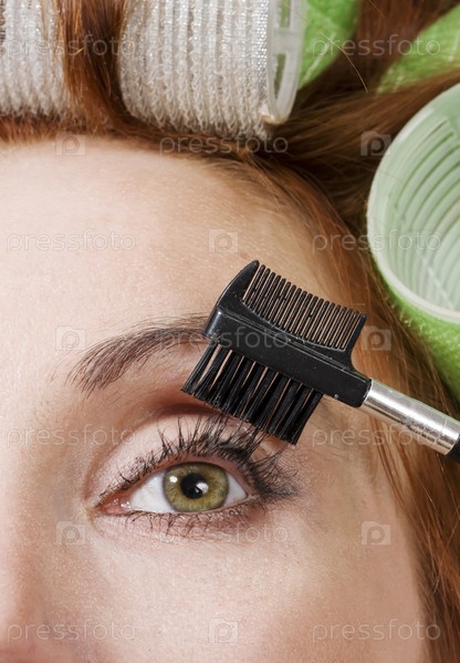 Женщина в бигудях делает макияж