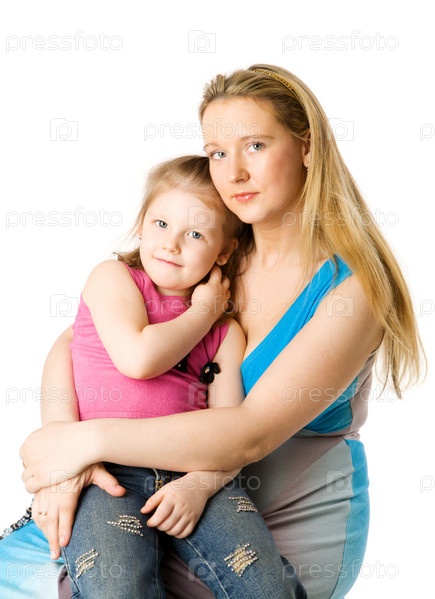 Мать с пятилетней дочкой на белом фоне