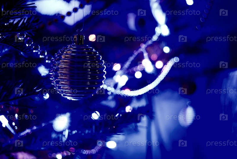 Новогодний шар и гирлянды на елке в темно-синем освещении